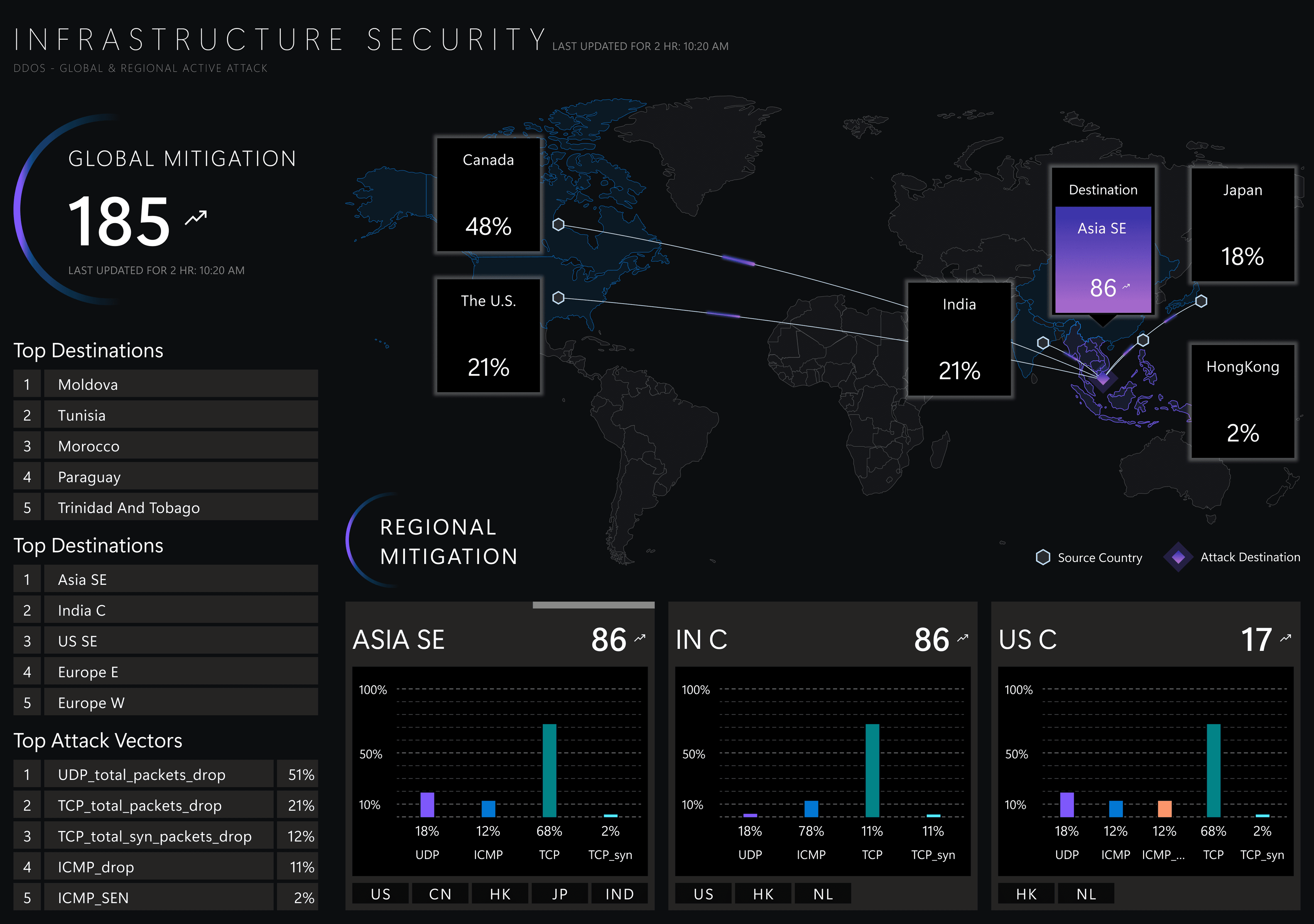 Create a glanceable dashboard visualizing 2-hour DDoS landscape (attacks, flows, mitigation, vectors), refreshed every 5 minutes via APIs.
